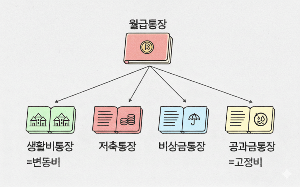 가장 핵심적인 원칙입니다. 월급이 들어오는 단 하나의 통장으로 모든 것을 해결하려는 습관부터 버려야 합니다. 목적에 따라 최소 3~4개의 통장으로 역할을 나누는 것이죠.